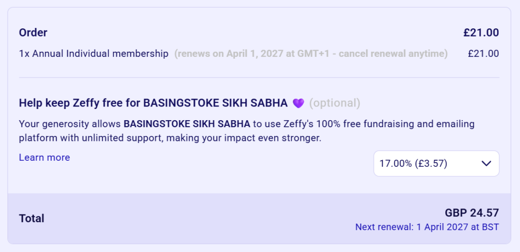 When making your payment, Zeffy automatically applies a 17% contribution to the platform. If you do not wish to add this, click ‘Other’ and type in zero manually. For more detailed instructions, click here.